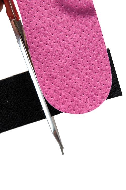 Ziehen Sie die Folie vom Flausch ab, legen Sie die Einlage und den schwarzen Flausch bündig an die Ferse an und drücken Sie diesen fest. Der Flausch verbleibt im Schuh. Statten Sie alle weiteren Schuhe mit einem Flausch aus.